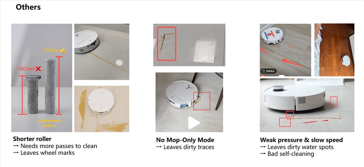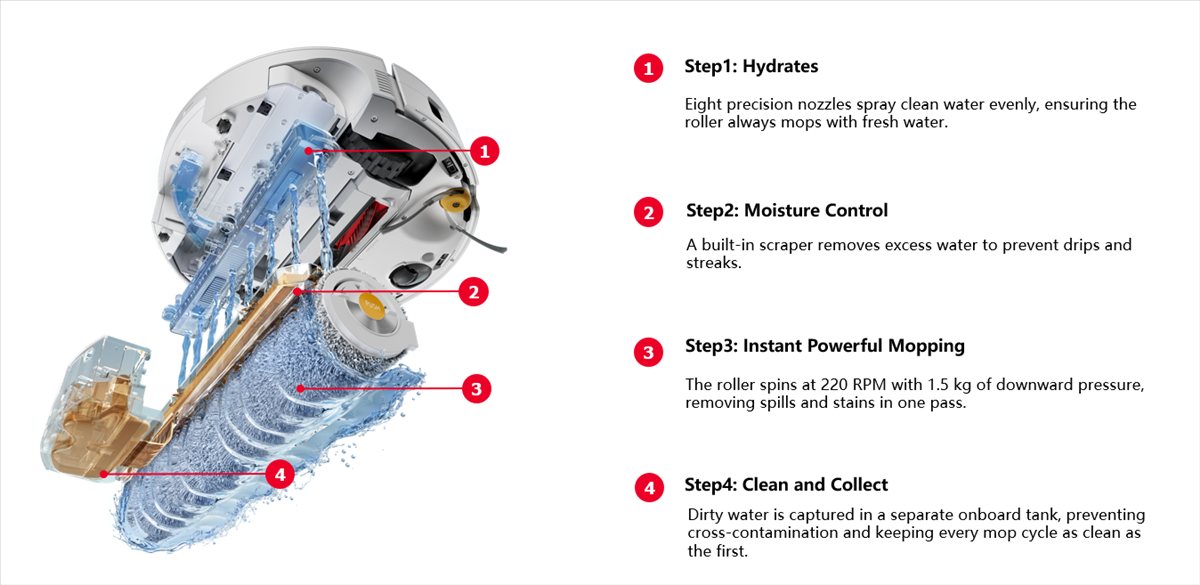 Rellenado inteligente (Smart Rewashing): si el sistema detecta que una zona ha quedado especialmente sucia, puede ordenar al robot que regrese a la base, lave el rodillo y vuelva a fregar esa zona.