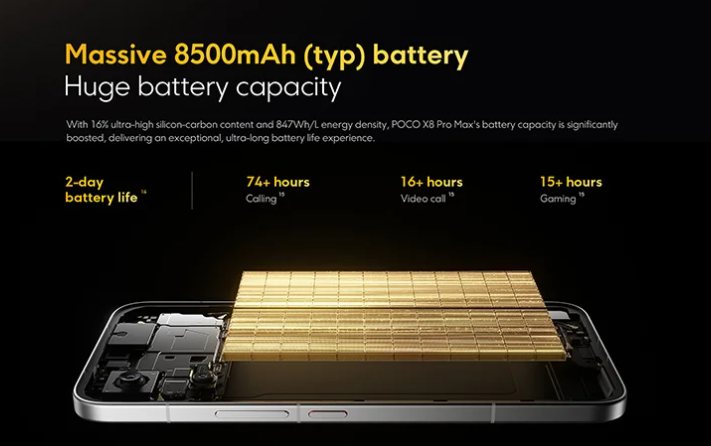 La primera sorpresa es cogerlo. Cuando te dicen que un móvil tiene 8.500 mAh de batería, te imaginas un ladrillo. Y sin embargo, el POCO X8 Pro Max mide solo 8,2 mm de grosor y pesa 218 gramos. Para poner eso en perspectiva: es más fino y ligero que un iPhone 17 Pro Max, con una batería vastamente superior. La clave está en las celdas de silicio-carbono con un 16% de contenido en silicio y una densidad energética de 847 Wh/L, una tecnología que permite empaquetar más energía en menos espacio.