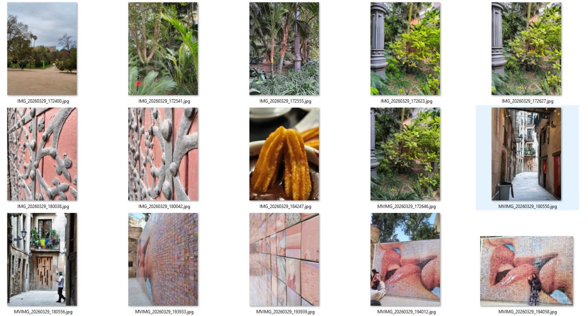 Los mosaicos del mural del beso de Barcelona son una prueba de fuego para la reproducción cromática: cientos de pequeños azulejos de colores que la cámara resuelve correctamente, con buenas transiciones entre tonos rojos, rosas, azules y neutros. También la Catedral de Barcelona al atardecer, con su piedra dorada contra el cielo azul, demuestra un rango dinámico que compite con móviles de precio muy superior.